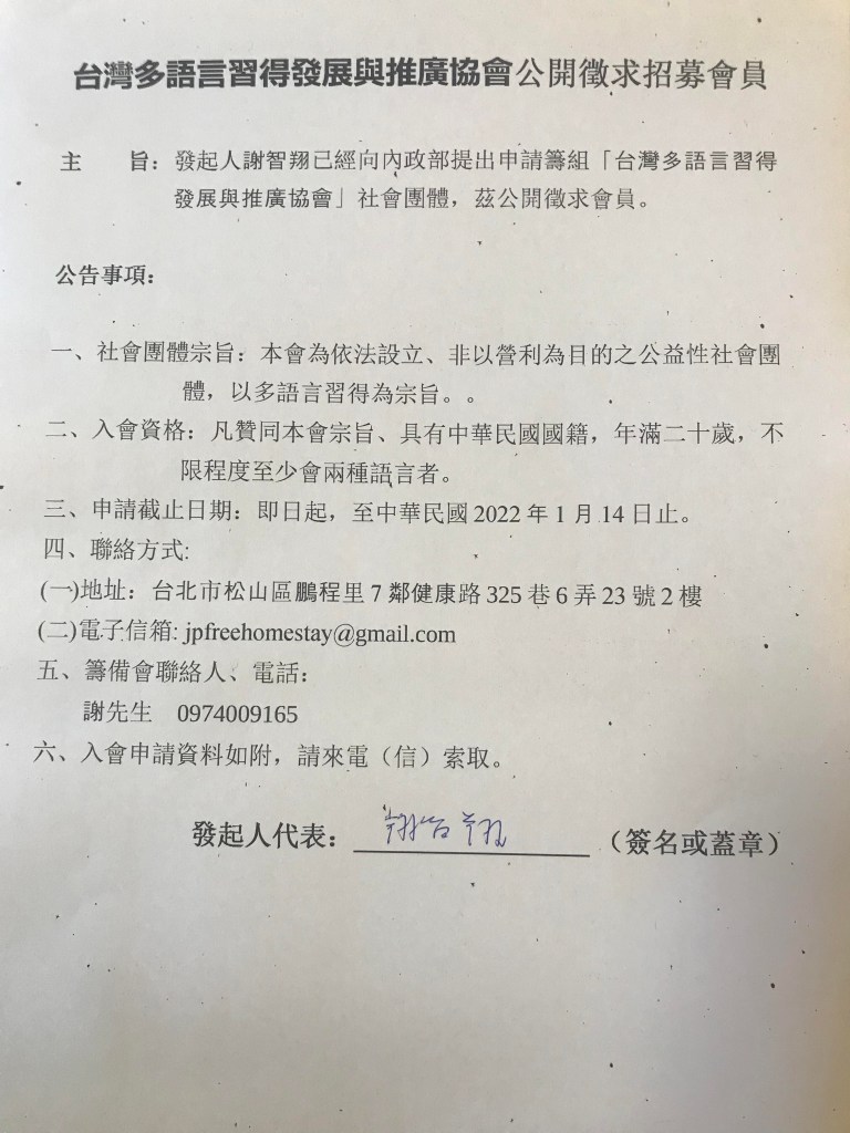 主 旨:發起人謝智翔已經向內政部提出申請籌組「台灣多語言習得發展與推廣協會」社會團體,茲公開徵求會員。