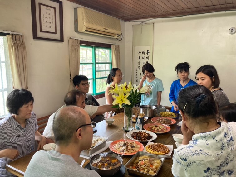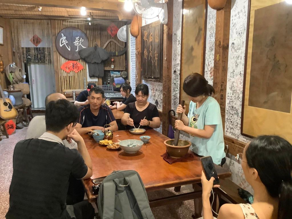 午餐是特別安排的「客家飯局」,母語人士和學員人數約2:1,席間所有的「北埔吃飯人員」都很有默契地只說客語,讓學員們真的融入北埔客庄的生活。