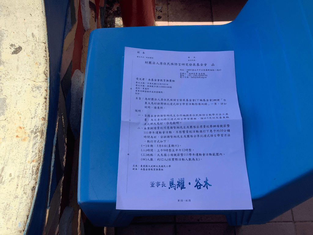 在”原語會”公文的庇蔭下我們得以參加大鳥國小的母親節運動會,和許多vuvu(排灣語的阿罵/奶奶)交流,最後所有人都還必須上台檢核兩天一夜的習得成果,過關的標準就是要能在大庭廣眾之下用排灣語自我介紹,不能看小抄也不能靠別人幫忙喔!