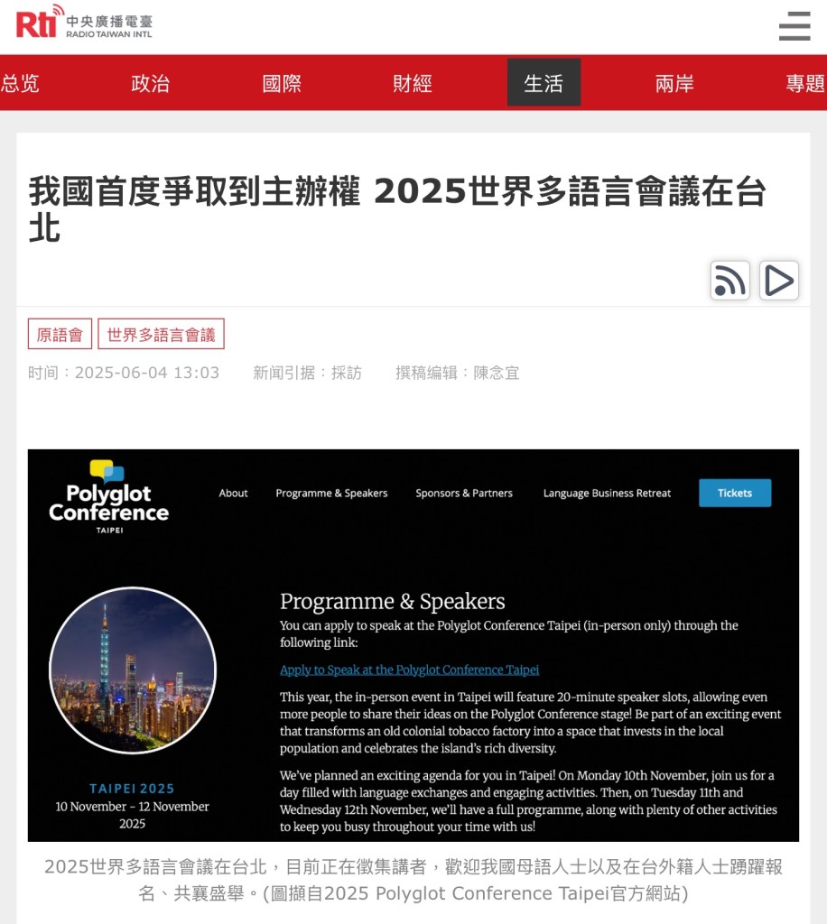“2025世界多語言會議在台北,目前正在徵集講者,歡迎我國母語人士以及在台外籍人士踴躍報名、共襄盛舉。”