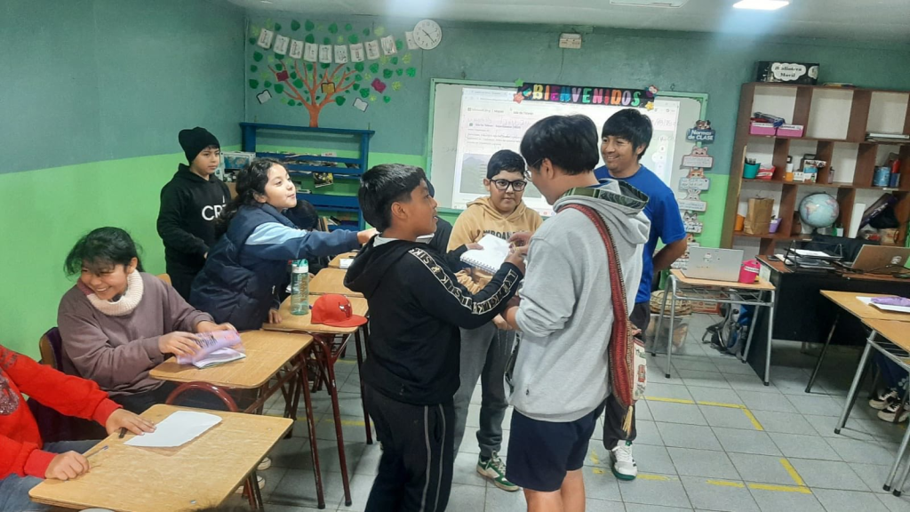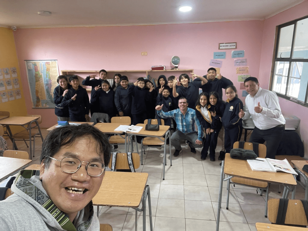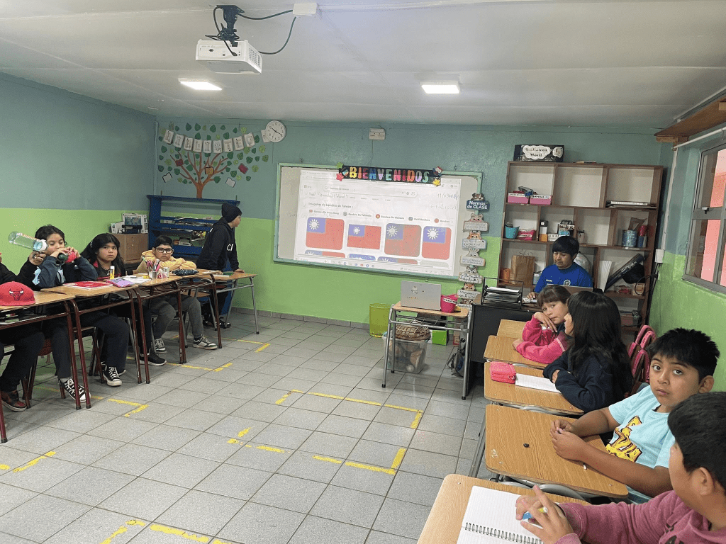 校長 Alex 先生帶著我前往所有的班級跟各年級的學童交流,對每一班的學童筆者都會先假裝不會說西班牙語,用全馬普切語自我介紹,觀察學童反應之後再換成西班牙語進行交流,介紹台灣並分享世界各地有趣的語言和資訊。