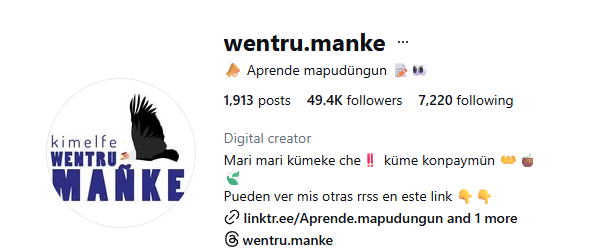 然後,這個情況在聖地牙哥等都會區開始有反轉的現象,部分馬普切族的年輕人開始有語言復振的意識,許多原本完全不會說母語的年輕馬普切人開始積極學母語,開辦學校和課程,不少人甚至以此為生,例如聖地牙哥的網紅 Wentru Manke,本身不是母語人士的他個人就有50萬追蹤者,自辦課程和相關教材。