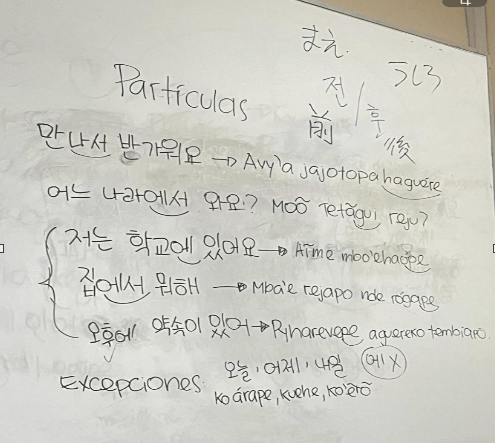 世界上主要膠著語揭示SOV語順,瓜拉尼語可能受到西班牙語影響,目前最通行的語順是 SVO。筆者這次有造訪一群學習韓語超過3年的巴拉圭人,並請他們去分析比較韓語與瓜拉尼語的異同,如下圖所示,同為膠著語的韓語的動詞都是在最後面,但瓜拉尼語的動詞都在前,學生當中的兩位母語人士(從小家中使用瓜拉尼語的人)表示,雖然瓜拉尼語 SOV 也行,但他們還是覺得 SVO 比較順。