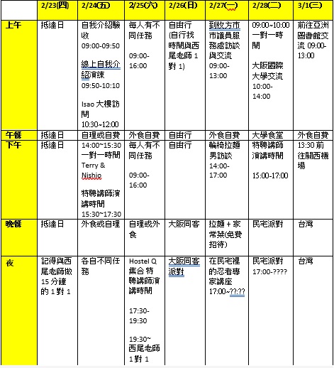 本次的行程安排與過往差不多,盡量讓參加者有機會整天都和日本人用日語做自然且有意義的互動,因其中一位成員參與大阪馬拉松的關係,我們把部分行程挪到最後一天早上,而大阪馬拉松那天讓大家自由行。